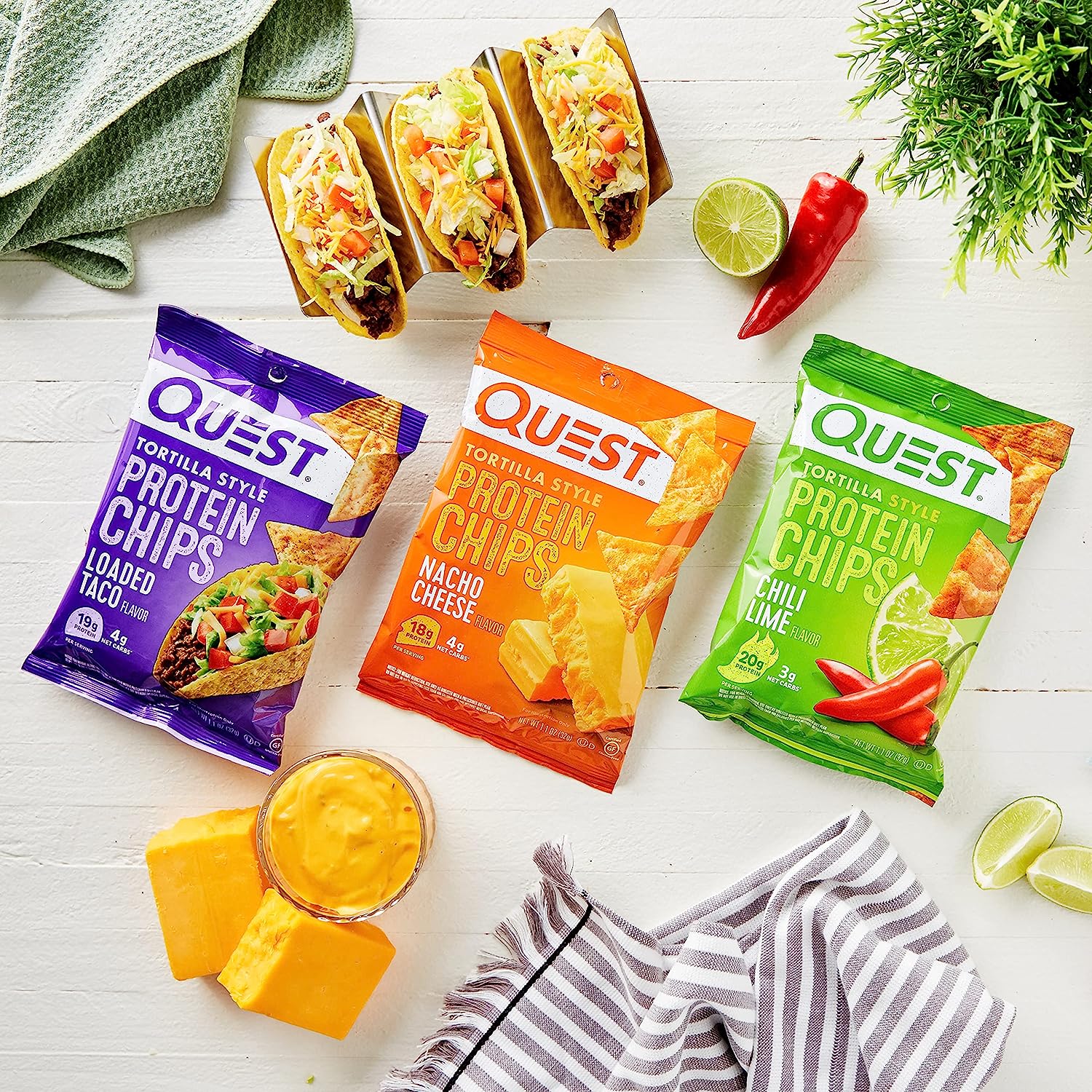 - CHIPS THAT TRAVEL WITH YOU: Take Quest Tortilla Style Protein Chips with you in your backpack, purse, car console, gym bag or wherever your adventures take you. Variety pack contains 12 Quest Tortilla Style Protein Chips (4 Chili Lime flavor, 4 Nacho Cheese flavor, 4 Loaded Taco flavor)